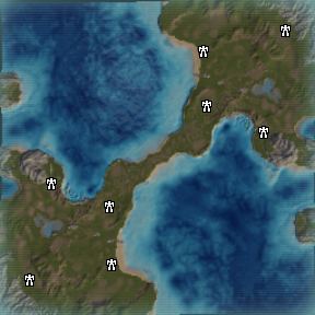 The 2 players on either flank are free to choose any strategy they like. Because of their positions, naval forces can be developed or disregarded as they please; however keep in mind that on this map naval forces are highly effective at attacking the center and bombarding the bases of the flank players. The large expanses of open ground behind each player's starting position need to be monitored carefully as they're prime positions for an unexpected air drop assault. A regular point of opposition between these players on either side are the 2 small, elevated islands on the sides of the map; with 5 mass deposits on each, these are extremely valuable. Because of their elevation, you must either fly an engineer in with a transport (and preferably some defense units) or send an engineer right up to the edge of the island and build a factory onto it from the water. Although their position definitely favours the left flank players, their opposite number on the enemy's right flank can still capture it and use it as a staging ground to assault the enemy.